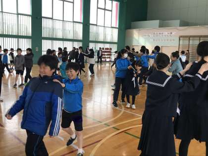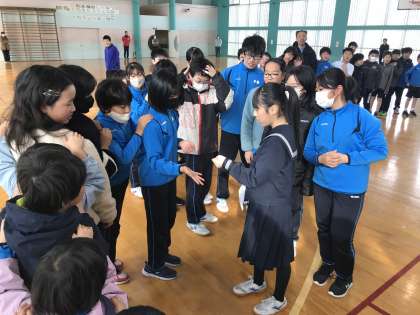 今日のつくし朝会の目的は「本年度を楽しく締めくくろう」です。することはジャンケン列車。みんなで音楽に合わせて、はい、ジャンケン。勝った人は先頭です。どんどん子どもたちが繋がっていきます。さあチャンピオンは誰か。えっ8年生!?ズルしてない。