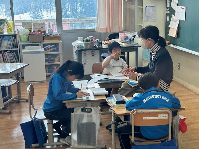 1・2年生は国語、それぞれ別の教室で学年に応じた勉強です。小さい子どもが集中力を100%発揮している姿は微笑ましいです。3年生は算数、今日から分数の単元に入ったようです。2年生で集中して学習した分数を覚えている子どもがほとんどです。4年生は図工の版画、集中して彫刻刀を使っています。刃物を扱うときの子どもの集中力はすごいですね。