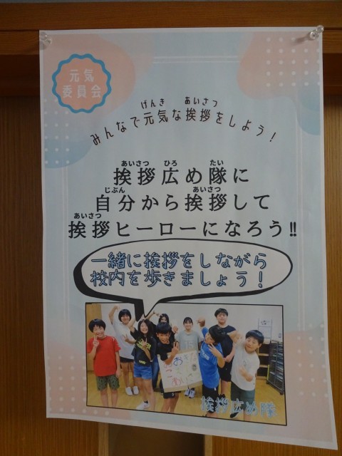 元気委員会が、全校に挨拶を広めたいと、昼休みに教室や廊下を歩きながら挨拶をしています。校長室に来て、このポスターを校内に貼ってもいいか尋ねてきました。私の答えは、「もっとたくさん印刷して、すべての教室に貼ってもらったらどうか」「あいさつ広め隊には校長先生を入れること」でした。先日、あいさつ広め隊の活動に参加しました。