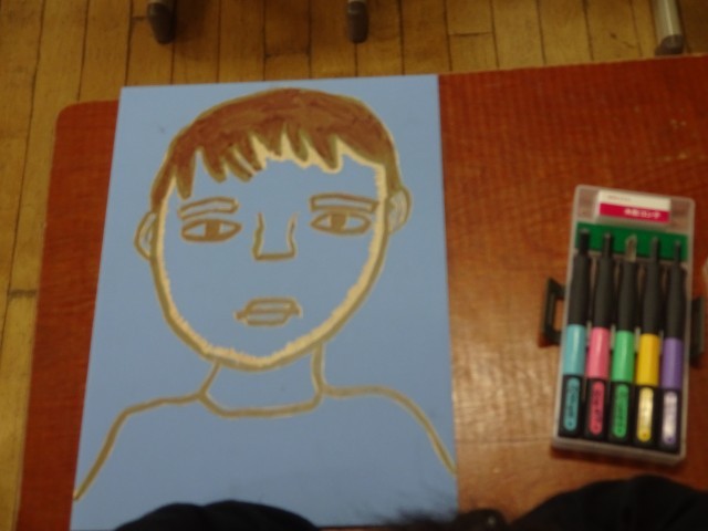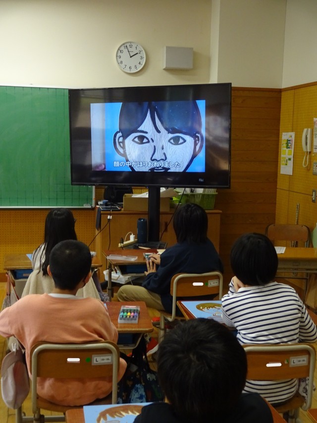 こどもは、図工で版画の学習に取り組んでいます。これは、4年生の教室です。映像を通して視覚的に彫り方を吸収します。