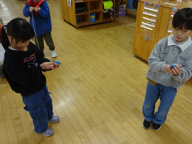 12月23日(火)、1年生が昔の遊びにチャレンジしている様子を再び見に行きました。上手になってきました。「僕ね、保育園の頃からコマ回しやっていたんだ」「〇〇さん、うまいなあ」「どうやったらできるの?」黙々とやるというよりも、一緒に遊びながら上達しています。3学期が楽しみです。