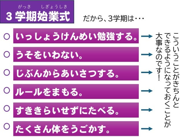 1月8日(木)、3学期の始業式が行われました。3学期はとても短いので、あっという間に月日が過ぎてしまいます。こどもが、充実した学校生活を送るために必要な6つの努力項目を伝えました。ぜひ、ご家庭でもご協力いただけると幸いです。