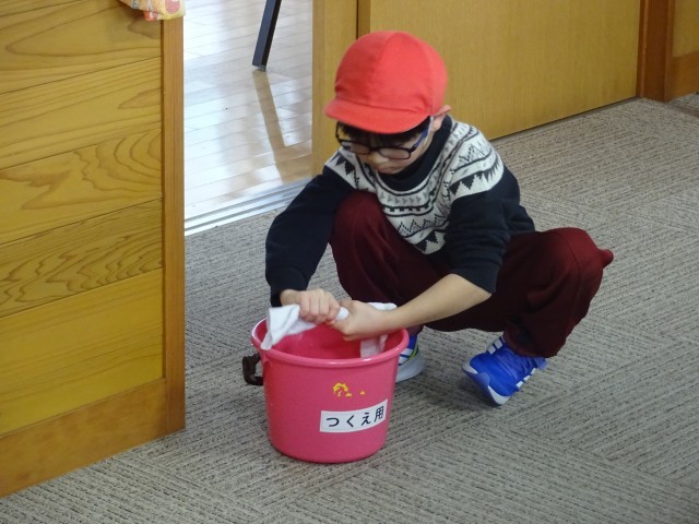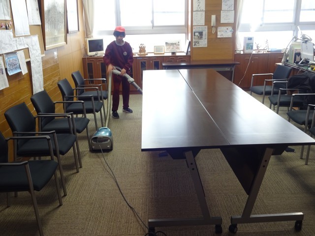 1月23日(金)、新しい清掃班での清掃が開始されて数日が経ちました。校長室は1年生と5年生の2人が担当です。写真の1年生は、雑巾がけの担当です。丁寧な清掃の様子が伝わってきますね。この1年生の姿を支えているのが、5枚目に映っている5年生の存在です。5年生が1年生に清掃の仕方を教える。すると、この1年生は4月から新しい1年生に清掃の仕方を教えるに違いありません。自分がされたことはしっかりと覚えています。いい循環です。