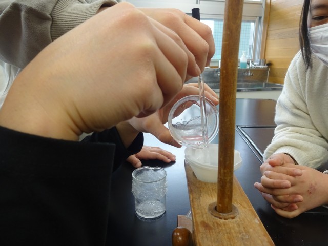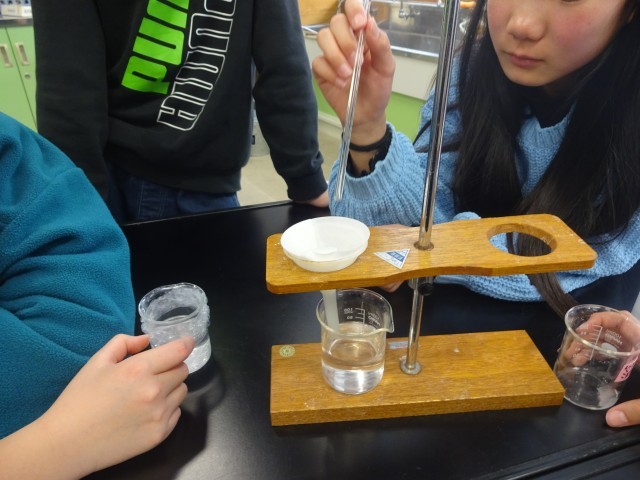 2月12日(木)、5年2組が理科室で実験をしています。黒板には「ろ過」の文字が。ミョウバンを溶かした水溶液と食塩を溶かした水溶液をそれぞれ濾過していました。「このたまっているものって水?」「そうだよ」「蛇口から出てくる水と同じってこと?」「え?そうじゃないの?」「じゃあ、このビーカーに入っている液体を飲んでもしょっぱくない?」「・・・たぶん・・・(もちろん飲んではいけませんよ)」「わかんない!」この分からないという疑問を持つことが何よりも大切。その疑問を解決するために実験しているんです。そういう追究の炎を燃やしている人は、ぐいぐい学んでいきますね。