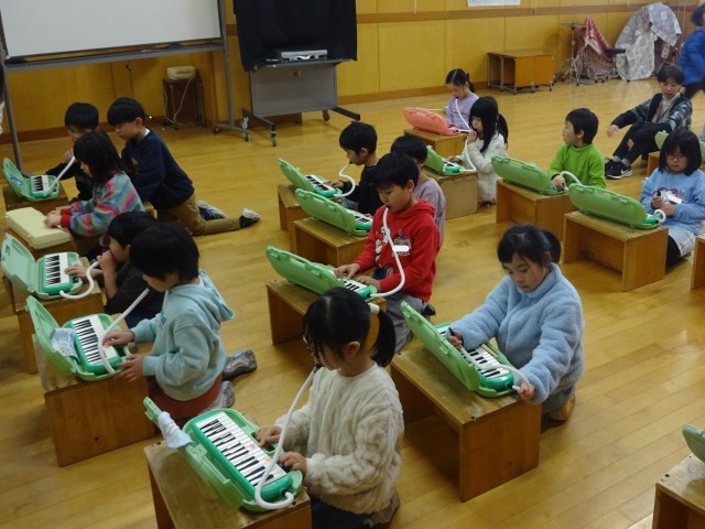 2月12日(木)、音楽室から鍵盤ハーモニカの音色が聴こえてきました。扉を開けると、教員がピアノを弾いています。そのピアノに合わせて、席に着いた人から鍵盤ハーモニカを吹き始めていたのです。最後には、全員が音を出しました。「さあ、席に着いて。準備ができたら鍵盤ハーモニカを吹きますよ」ではなく、このような方法もあるのですね。勉強になりました。