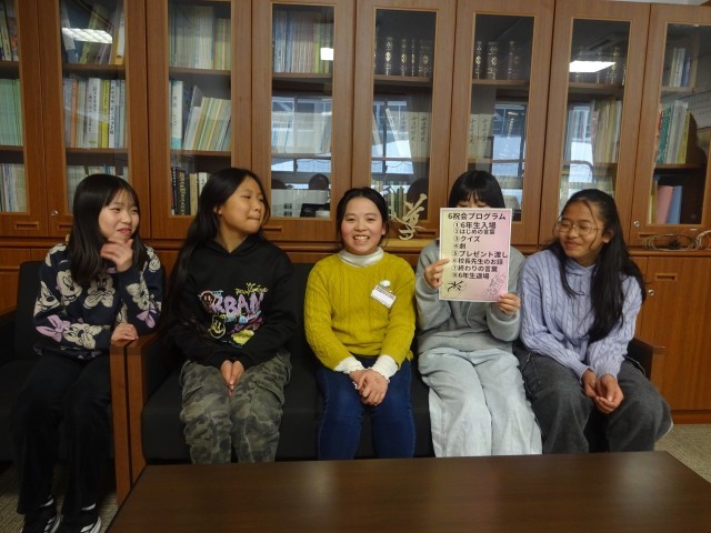 ソファに座った5年生5人。「ろくしゅくかいの時に、校長先生から卒業生にスピーチをお願いします」「ろくしゅくかい?」