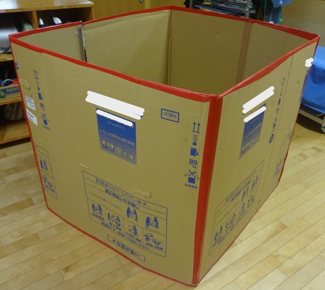 5年生の廊下に折りたたんでありました。広げてみると、1㎥の大きさを実感できるようにと、段ボールで作られた模型です。量感覚を養うために教員はこのように工夫しています。