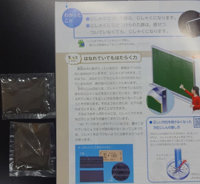 3年生が理科室で授業の開始を待っています。もうすぐ担当職員が来ることでしょう。「今日、何やるの?」「砂鉄!」「砂鉄?」「今何勉強してるの?」と尋ね教科書を見せてもらいました。なるほど!袋の中には砂鉄が入っています。そして、その理由も分かりました。