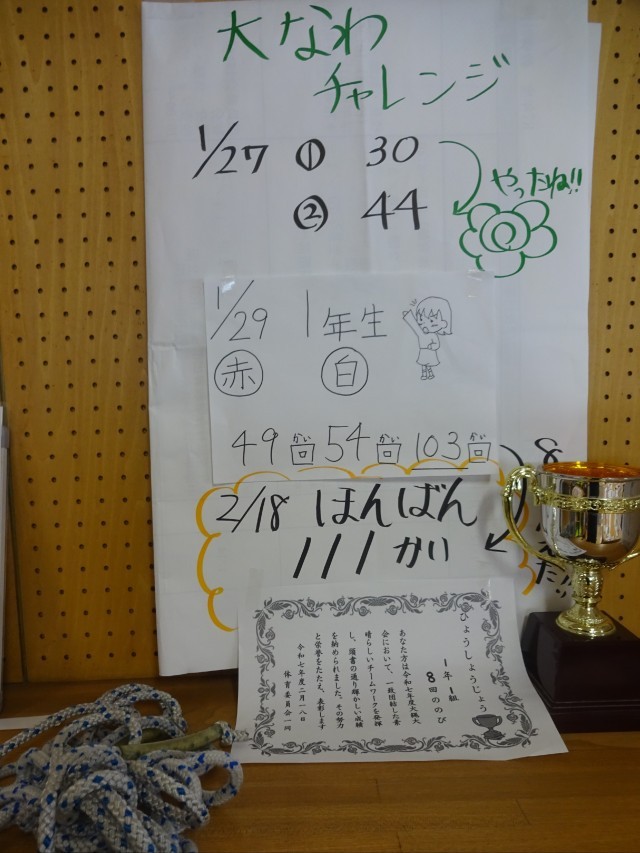 1年生の廊下には、縄跳び大会に向けて一致団結してきた証が掲示されていました。そばには、縄跳び用の縄も添えられていました。1年生のみんなおめでとう!