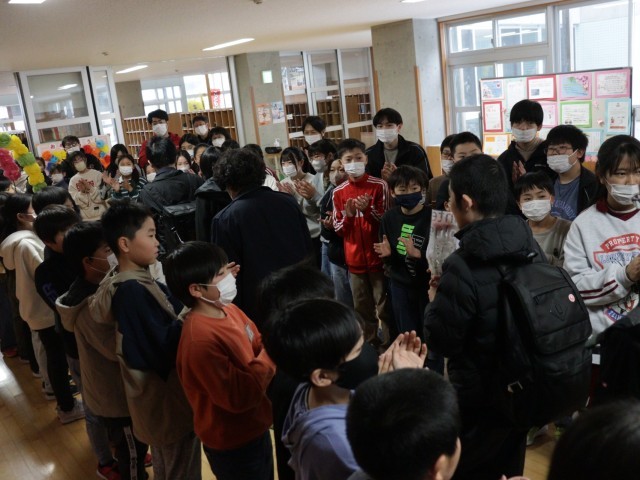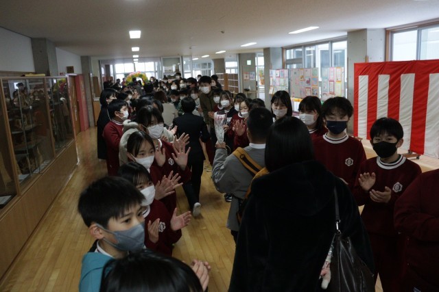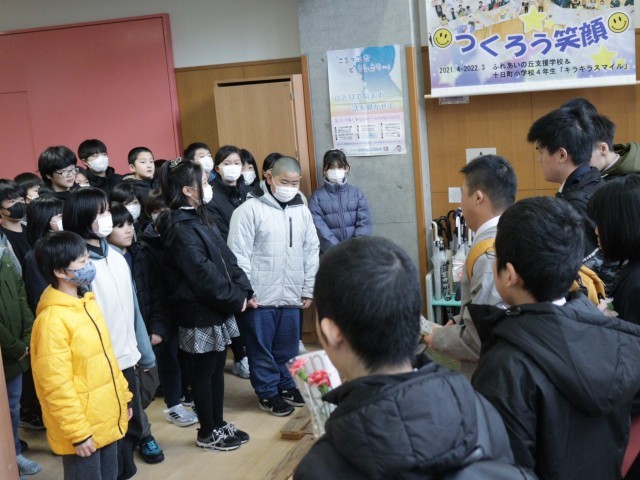 3月19日(木)は、ふれあいの丘支援学校の卒業式です。式が終わり、卒業生の見送りの場面には、毎年十日町小学校のこどもが花道を作って参加します。それは、いろいろな活動を一緒にしてきた仲間の門出です。「おめでとう!」そんな思いをこめて見送りました。