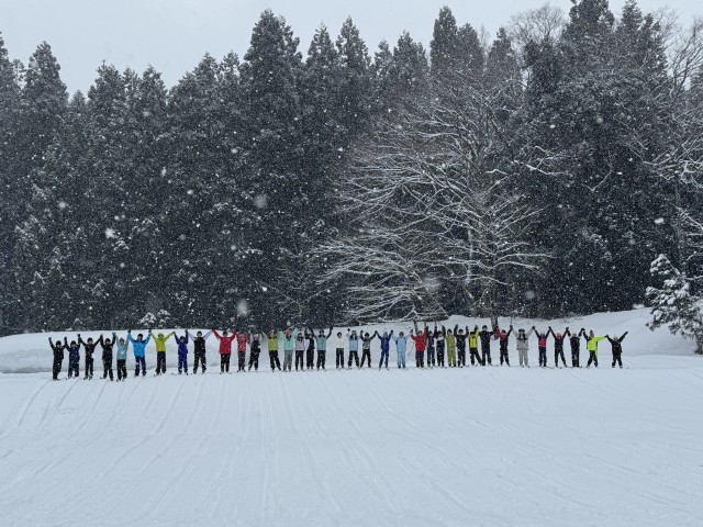 集合写真に写っている白い塊は雪です。冬は雪が降って当たり前です。こんなのへっちゃ...