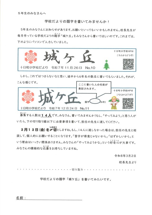 2月26日(木)、児童集会にて新旧委員会の引継ぎ式が行われました。新しい委員会の...