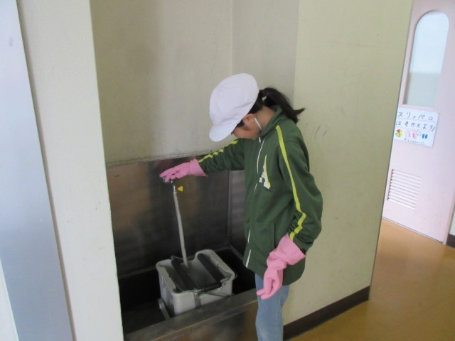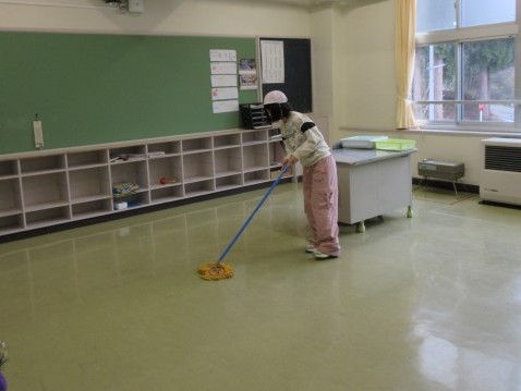 清掃は、月曜日は1階、木曜日は2階と決めて全校児童で行っています。1つの教室を2人や3人で担当し、机やホワイトボードを移動させながら黙々と掃いたり、拭いたりしてきれいにしています。人数が少ないので一人がいくつもの仕事を担当します。それでも当然のように一生懸命働き、自分の仕事が終わるとまた当然のようにほかの人の仕事を手伝う子どもたちです。