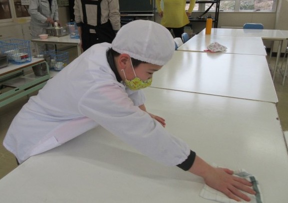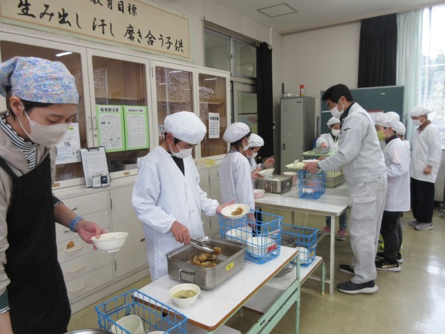 給食準備も全員で行います。食器運び、台拭き、盛り付けなど職員も交じって分担して準備をします。6年生をリーダーに手際よく働くので、あっという間に配膳が終わります。おかげでいつも楽しい給食の時間を過ごせています。