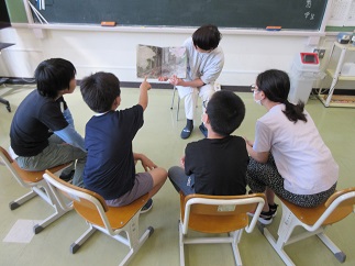 読み聞かせをしてくださる「イマジン」の皆様から、今年度初めておいでいただきました。1〜3年生と、5・6年生の2つのグループでお話をお聞きしました。穏やかで抑揚のある語りに、子どもたちは本の世界に引き込まれ、浸っていました。読んでいただいた後、今度は5・6年生が分じろうで発表した「入山のやかんころばし」のお話を聞いていただきました。とても褒めていただいて、子どもたちは満足そうでした。(読み聞かせは)「好きなことですから」と朗らかに話され、子どもたちと温かく接してくださる姿を見て、この活動が本に関心をもつきっかけになっていることを改めて実感しました。