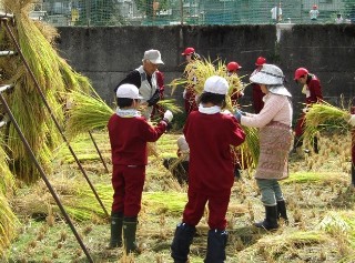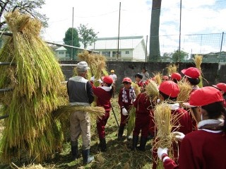 5月に田植えをした稲が約4か月たって見事に実り、秋晴れのもと、5年生が稲刈りを行いました。地域の先生方に手ほどきを受けながら、稲刈り鎌を使って稲を刈りました。束ね方も教えていただき、はざかけにも取り組みました。落穂を見逃さずに拾う姿もあり、お米を大切にしようという気持ちが伝わってきました。地域の先生方から教えていただき、貴重な体験ができました。