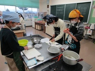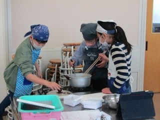 5年生が家庭科の調理実習で「みそ汁作り」に取り組みました。16日(火)には2組が、そして18日(木)には1組が、それぞれ身支度を整え、家庭科室で行いました。家庭科室に入ると煮干しの出汁のいい香りが満ちていました。班のメンバーで協力して調理をするとともに、片付けも手際よく行っていました。出汁の取り方や具材の切り方、入れる順番等を学び、最後には、みんなで調理したみそ汁をおいしくいただきました。