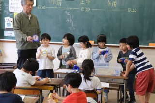 時刻と時間の学習の導入として、1年生で学習したことの復習を兼ねて時計で表しました。