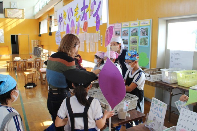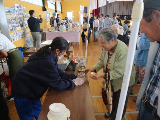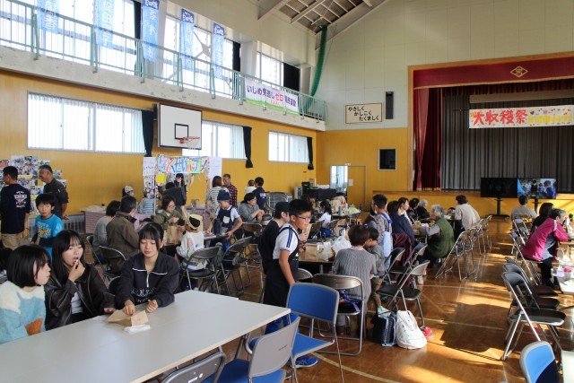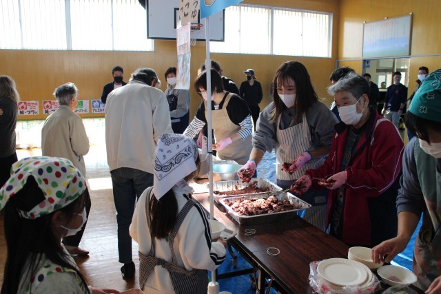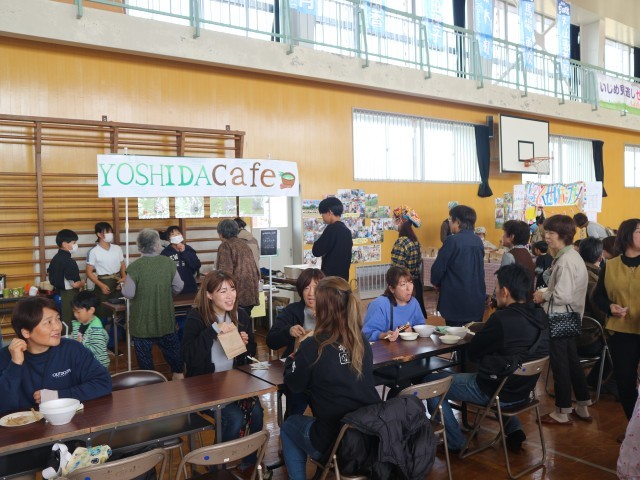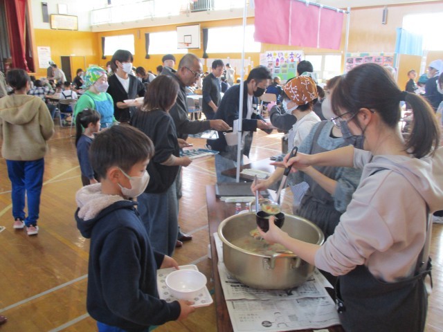 学校で収穫した大根やサツマイモ、吉田産の長ネギや里芋など、秋の味覚がたっぷりの豚汁も大好評でした。