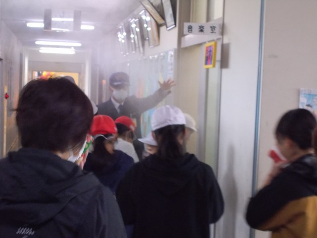 けむり体験は、煙を充満させた音楽室に入って歩行しました。体を低くすることや、手で壁を触ることなどを学びました。