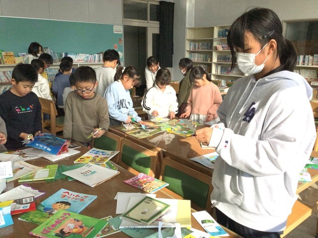 新刊本の表紙カバーを活用し、本つりゲームやしおり作りを行いました。