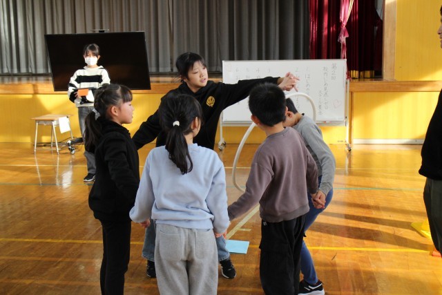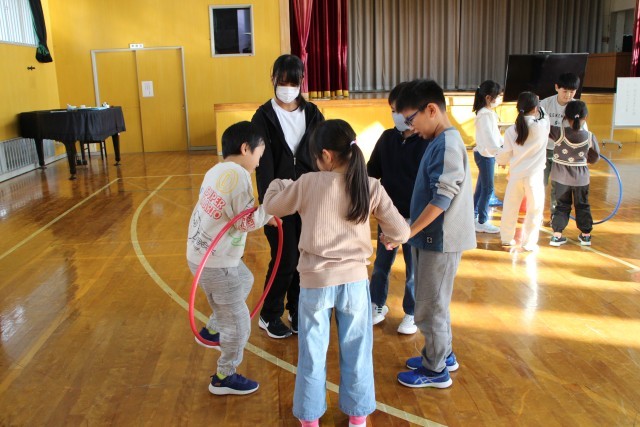 まず、アイスブレイクとして、縦割り班で輪くぐりゲームをしました。