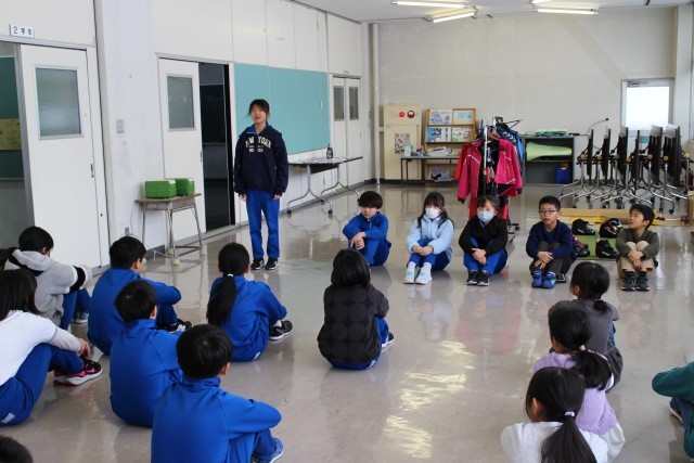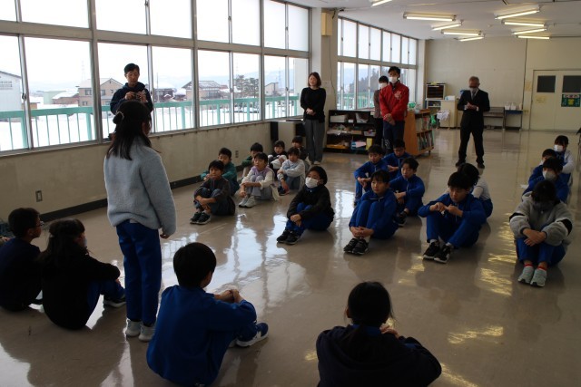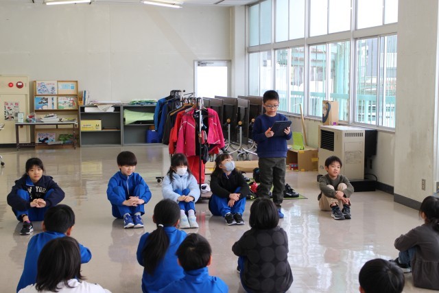 全校朝会で、代表児童が3学期のめあてを発表しました。