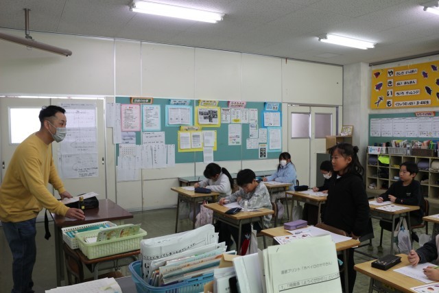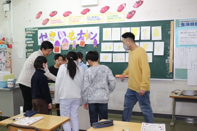 子どもたちから「人の目を引く色はどんな色ですか?」「かわいいキャラクターをかくにはどうしたらよいですか?」「この看板をもっとよくするためにはどうしたらよいですか?」など、積極的に質問が出ました。子どもたち干し芋販売に向けて、子どもたちはよりよいパッケージやチラシ、看板を作ろうと、奮闘しています!