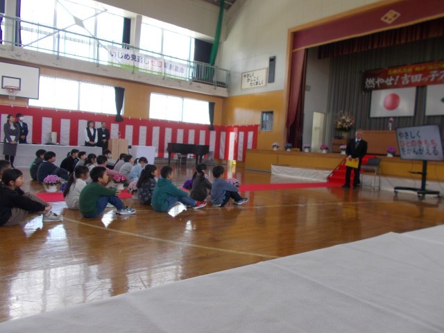 始業式では、校長先生から「聴く」ことについてのお話があり、児童は目と耳と心できちんと話を聞きました。