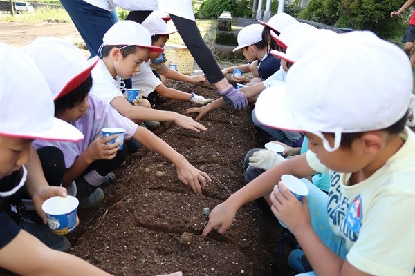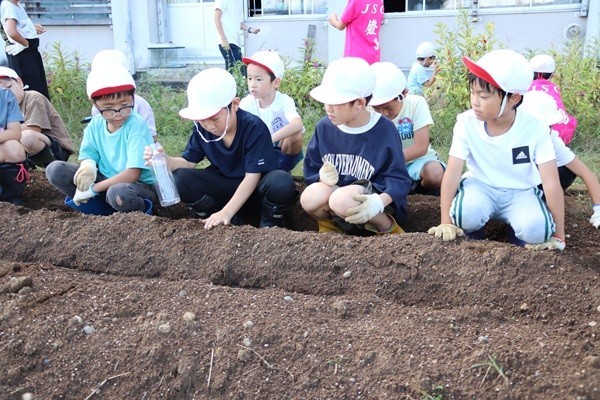 朝は雨混じりの天気でしたが、だんだん晴れてきて午後は畑日和になりました。今日は、1・2年生が秋野菜のかぶとだいこんを植えました。国語科の教科書にある『大きなかぶ』のお話に出てくる大きなかぶに育つように願いを込めて種を植えました。