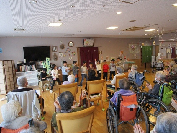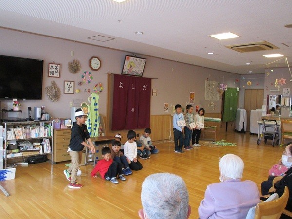 11月5日(水)に学校の目の前にある、複合型介護施設よしださんとの交流を1・2年生が行いました。先日の文化祭で発表したおおきなかぶの劇を見ていただきました。コロナ禍で交流が少なくなっていたのですが、よしだの皆さんは、学校でマラソン大会や運動会などがあると必ず応援看板を出してくださり、おじいちゃんおばあちゃんが元気に応援してくださいます。いつも元気をいただいている子どもたちが今度は自分たちが何かしたいと考え、交流が実現しました。これからも継続的な交流を行っていきたいと考えています。