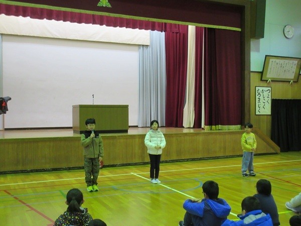 12月24日(水)今日は、2学期終業式がありました。79日間の2学期でした。1・3・5年生の代表から2学期にがんばったことと冬休み、3学期の目標の発表がありました。一人一人がんばったことがあり、充実した2学期であったことに喜びを感じました。全校児童が登校できた欠席ゼロの日が多く、ご家庭のサポートに感謝でいっぱいです。冬休みは、家庭と地域で日本の文化に触れる機会が多くあります。外は寒いですが、内は充実した冬休みになることを、そして元気よく3学期スタートに会えることを願っています。