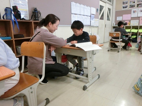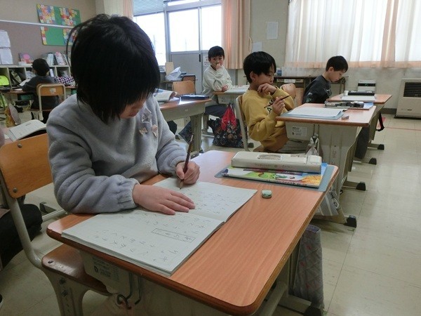 1・2年生は10名の複式学級です。今日の国語の授業は、1年生と2年生が違う学習内容に取り組みます。こういうときに「ずらし」とか「わたり」という教育技術を使って、どちらの学年でも課題を追求していきます。1年生が、追求課題◎を設定し、問題解決に取り組み始めるまで、2年生は漸次に学んだところの漢字練習をしています。どちらの学年の子どもたちも、集中して学習に取り組む姿が見られました。
