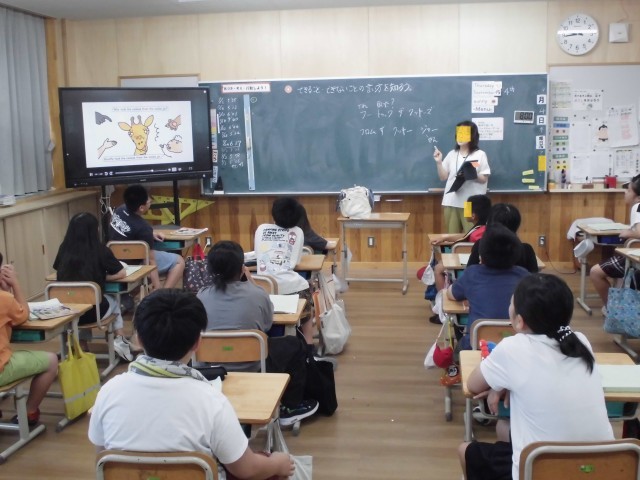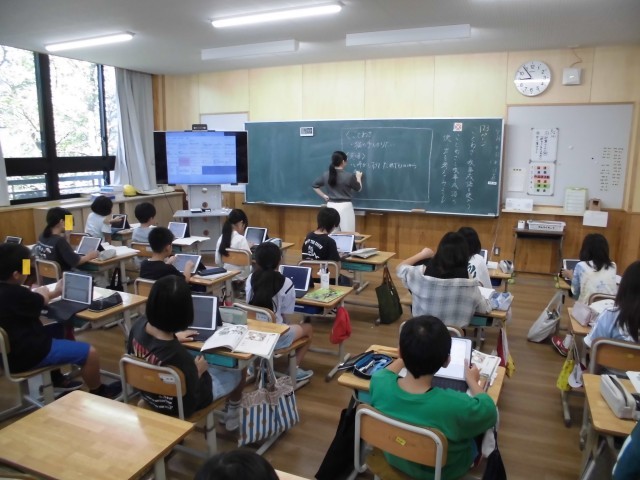 授業では、4年生と5年生です。4年生は国語、5年生は外国語を学習していました。