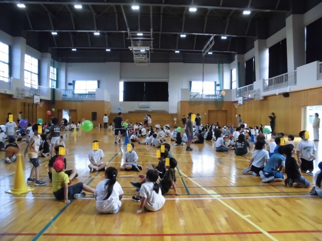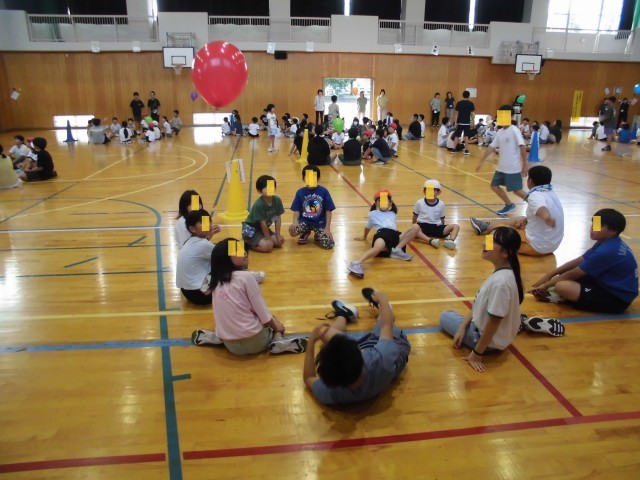全校縦割り班で円を作り、班のメンバーで協力し、風船を落とさずに何回レシーブを上げられるか競い合う内容でした。