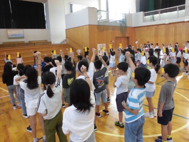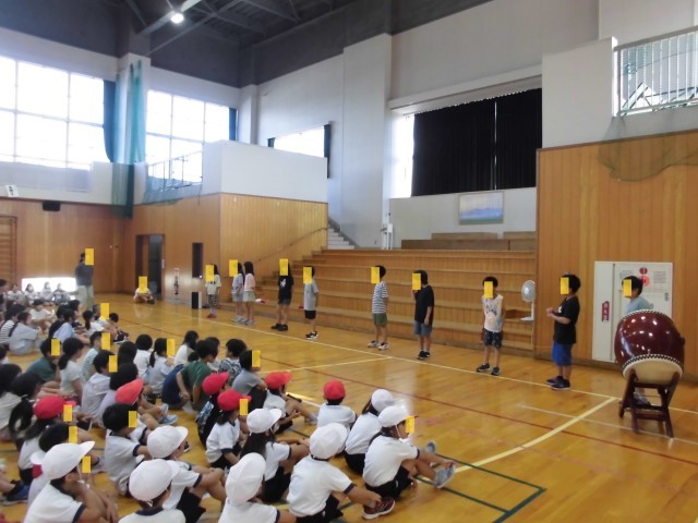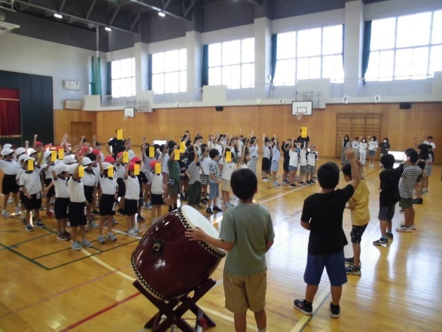 4年生のリーダーが大きな声でエールを送り、1年生から4年生までの子どもたちが、それに続いて元気よくエールを送っていました。