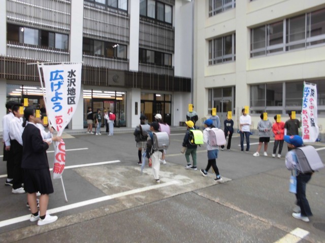 今日は水沢小学校児童玄関前での交流を紹介します。
