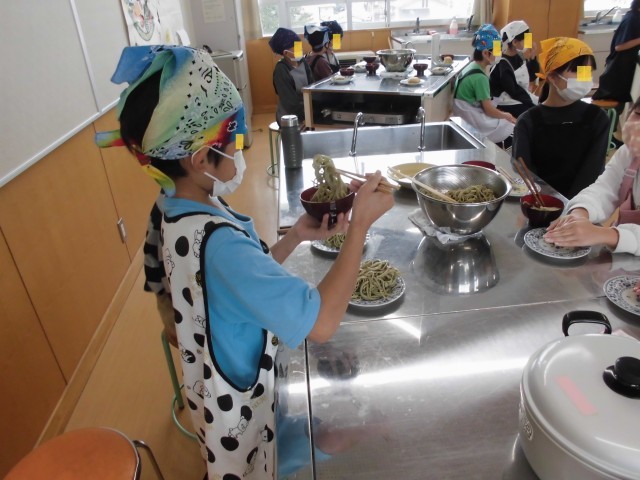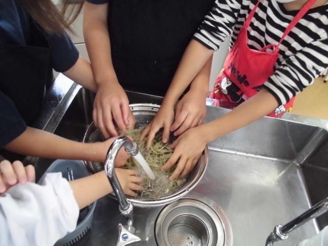 先日3年生が収穫した「からむし」を麵に練りこみ、油あげの中に入れて食べる実習です。