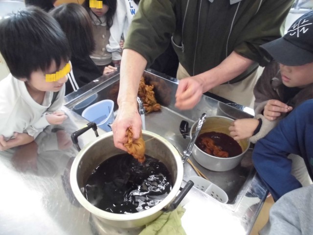 今日の午前、3年生は先日自分たちで収穫した「からむし」を使って、染め付け体験を行いました。