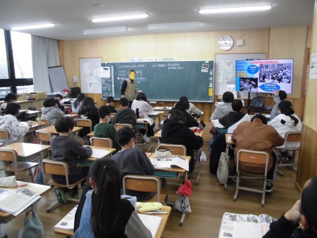6年生は社会の授業です。戦時中の生活について、動画を交えて学習していました。当時の子どもたちの様子や学校生活の様子など、現代との大きな違いを学んでいました。とても意義深い内容の学習です。子どもたちは学習内容を、丁寧にノートにまとめていました。