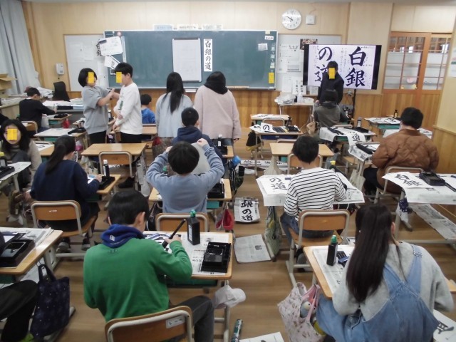 6年生は習字の授業です。精神を集中し、筆に心を込めている様子がとても伝わってきました。
