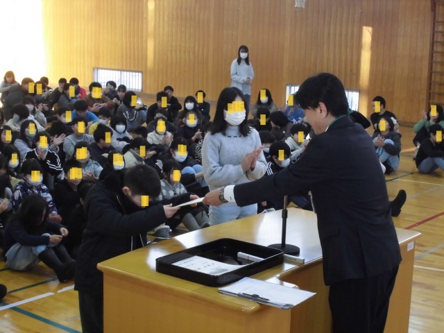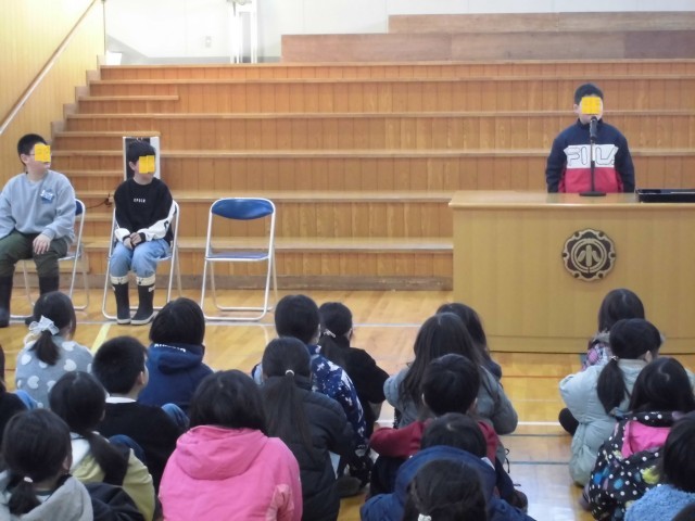 全校集会では、3名の児童による「冬休みの振り返り、3学期のめあて」発表。中越美術展の表彰、1月の生活目標の発表がありました。