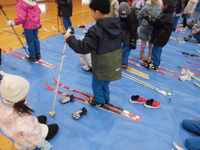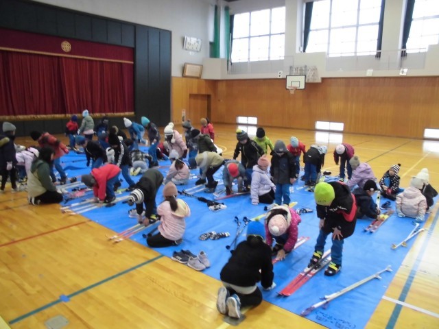 そんな中、1、2年生は合同でクロスカントリースキーのはき方練習を行っていました。