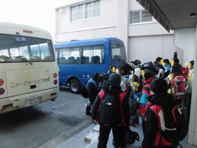 子どもたちはスキーウエアを着て、バスに乗り込んでいきました。