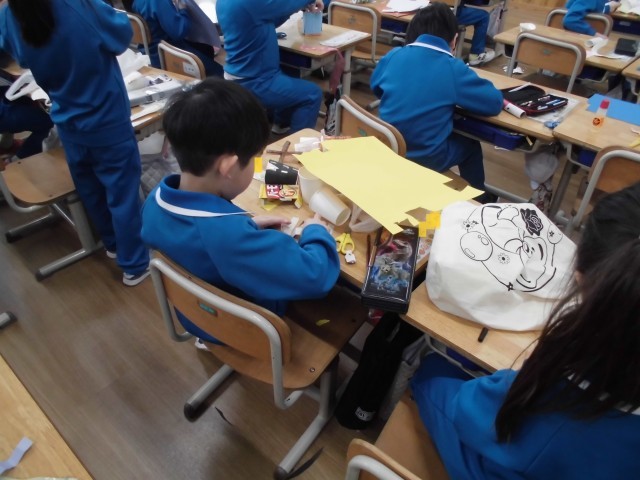 1年生は図工の授業の様子です。厚紙を使っていろいろなものを作っていました。何ができるかは今後のお楽しみです。