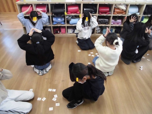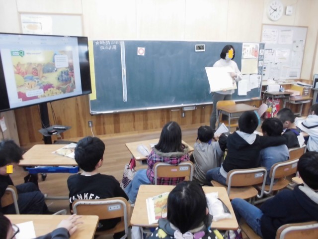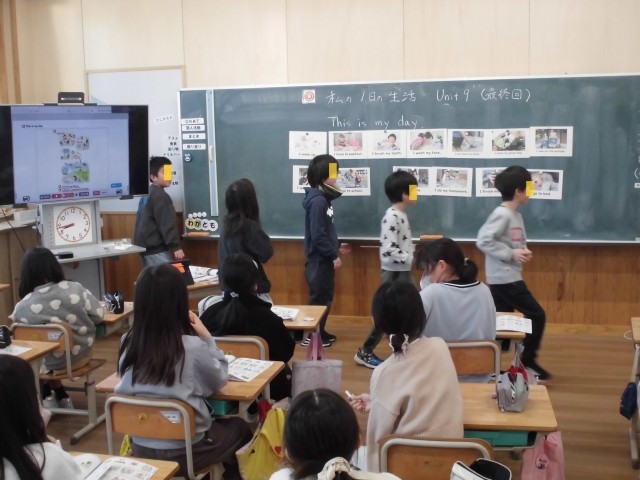 最後の授業では、3年生は英語の絵本の読み聞かせ、4年生は1日の生活に関わるジェスチャーゲームとカルタを行いました。