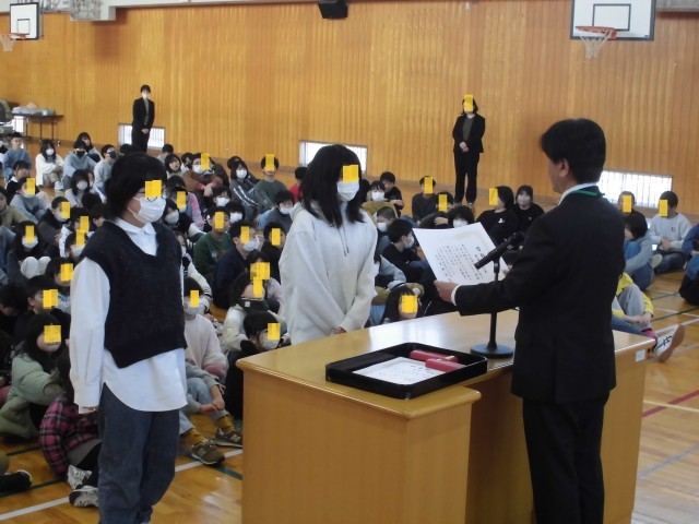 その後6年生児童2名に「6年間皆勤賞」の表彰を行いました。1日も休まず、元気に登校できたことが評価されました。何より元気に登校し、学校生活を過ごしてくれた証です。大変おめでとうございました。