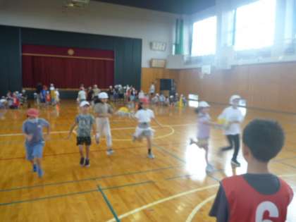 新聞紙を二人で持ち、その上にボールを置いて運び合うリレー。