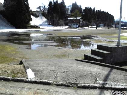 冬の間たくさんあったグラウンドの雪がどんどん解けています。前庭の雪も完全になくなりました。金次郎さんの像も冬囲いが外され、春の日差しを浴びています。