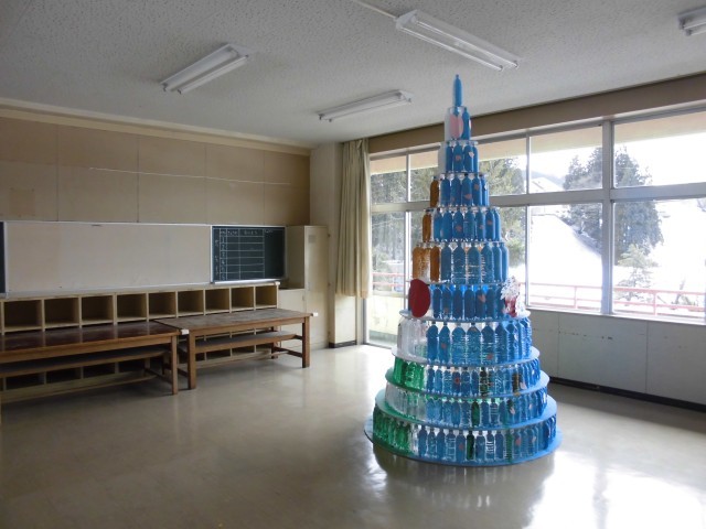 2階の学習室には、閉校記念式典で作成したペットボトルタワーが置かれています。